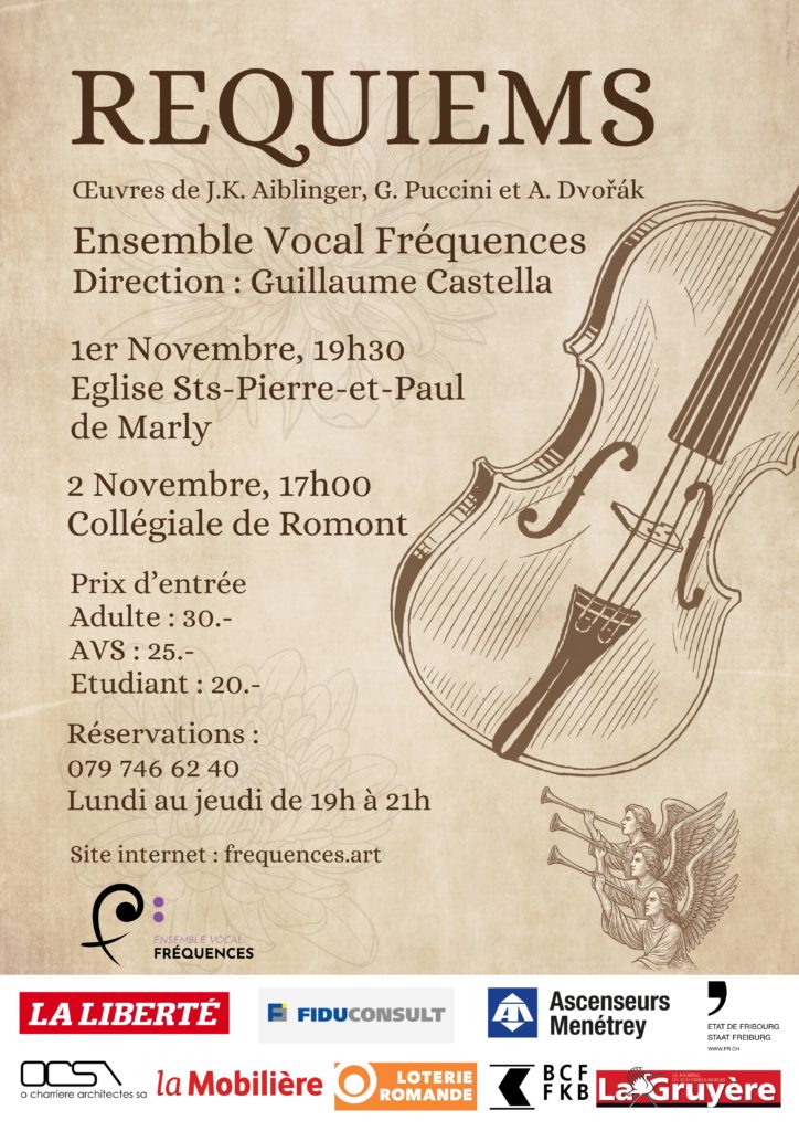 Le week-end du 1er novembre 2025, l’Ensemble Vocal Fréquence proposera un programme autour du Requiem. L’EVF interprètera le 1er novembre à l’église de Marly et le 2 novembre à la collégiale de Romont deux Requiem très différents dans leur conception. Le Requiem de Giacomo Puccini (1856-1924) est une œuvre courte composée en 1905 pour le quatrième anniversaire de la mort de Giuseppe Verdi. Cette œuvre dure un peu moins de cinq minutes, mais illustre toute la force dramatique de Puccini. Composé pour orgue et chœur, elle fait intervenir un alto solo qui entonne un contre-chant spectral dont la particularité réside dans une articulation en décalage par rapport au rythme de marche funèbre de l’orgue. Le Requiem en ré mineur de Johann Kaspar Aiblinger (1779-1867) pour chœur, cordes, orges, cors trompettes (ad. lib.) et timbales (ad. lib.) a été composé autour de 1840. Il s’agit du premier de ses deux requiem. Il présente ce mélange entre l’esthétique grandiloquente de l’opéra et un archaïsme propre à la fascination de l’époque pour la musique ancienne. L’Ensemble Vocal Fréquences proposera une des rares exécutions modernes d’une œuvre qui n’est, à l’heure actuelle, pas disponible en enregistrement. Ces œuvres seront encadrées par deux compositions pour orchestre à cordes traduisant la profonde mélancolie du concert : le Nocturne en si majeur d’Antonin Dvorak (1841-1904) et l’élégie funèbre de Puccini, Crisantemi dont la citation accompagnera la mort du rôle-titre dans son opéra Manon Lescaut.